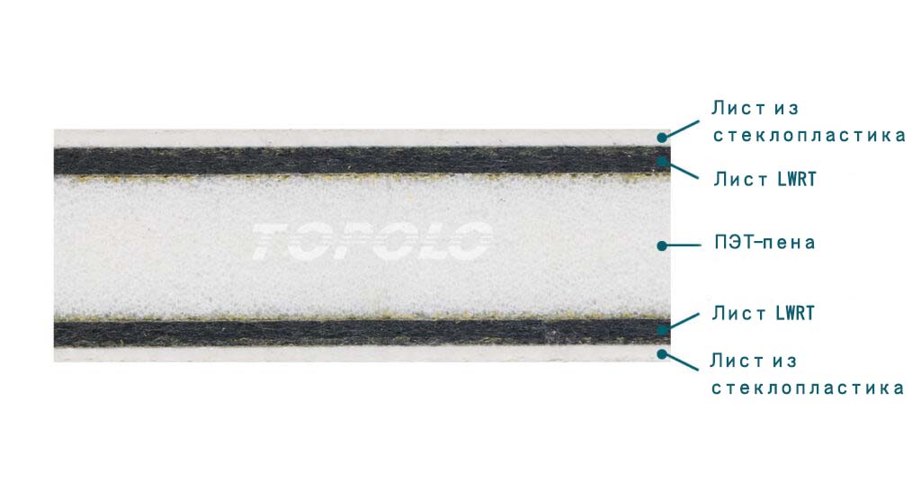 Он состоит из полипропиленовой (PP) матрицы и арматуры из стекловолокна. Он обладает высокой прочностью, лёгкостью, отличной звукоизоляцией и поглощением, огнеупорностью, экологичным и пригодным для переработки. Добавленный между ядром и облицовкой, он поглощает энергию внешних воздействий и усиливает прочность композитной панели.