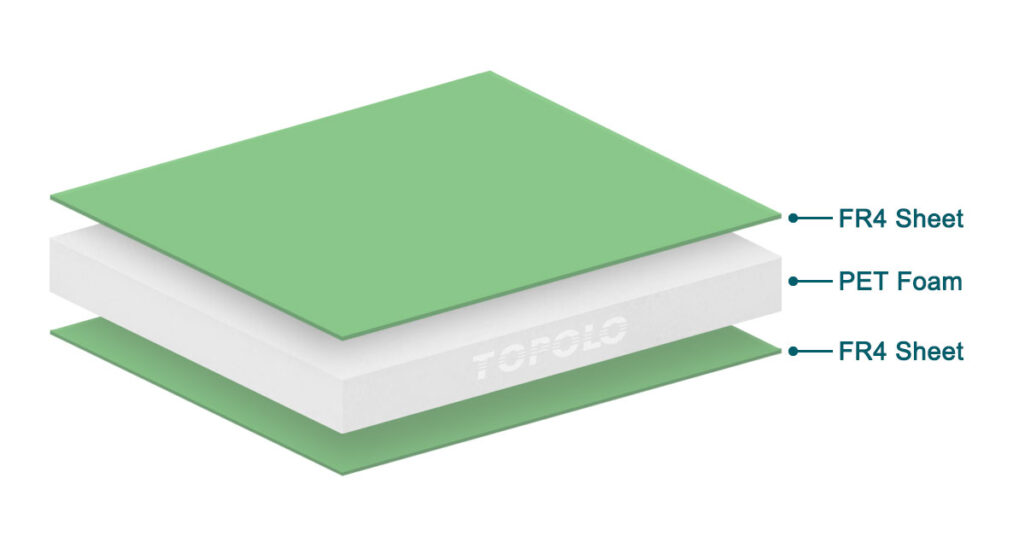 ПЭТ-пена (полиэтилентерефталатная пена) — экологически чистый, перерабатываемый материал — широко выбрана в качестве основного материала благодаря исключительному балансу лёгкости конструкции, механических свойств и долговечности. Будучи жёсткой пеной с закрытыми ячейками, она играет ключевую роль в повышении общей производительности сэндвич-панелей. Интегрируя ПЭТ-пену в ядро, сэндвич-панели из ПЭТ-пены с FR4 достигают оптимального сочетания лёгкости конструкции, прочности конструкции, изоляционных возможностей и экологической ответственности.