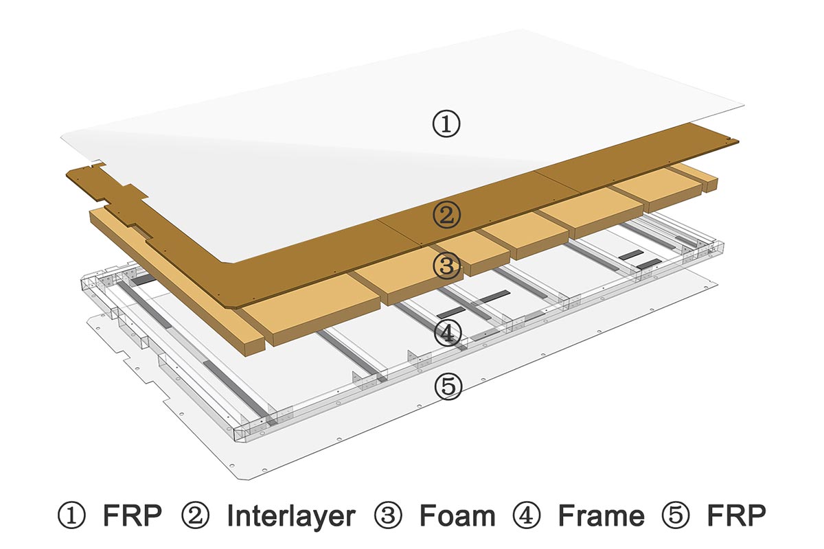 Черновой пол рефрижераторного грузовика, спроектированный компанией TOPOLOGROUP, представляет собой многослойную конструкцию из сэндвич-панелей, которая обеспечивает прочную опору для поверхностного пола с учетом теплоизоляции, прочности конструкции, водонепроницаемости и плоскостности рефрижераторного бокса.