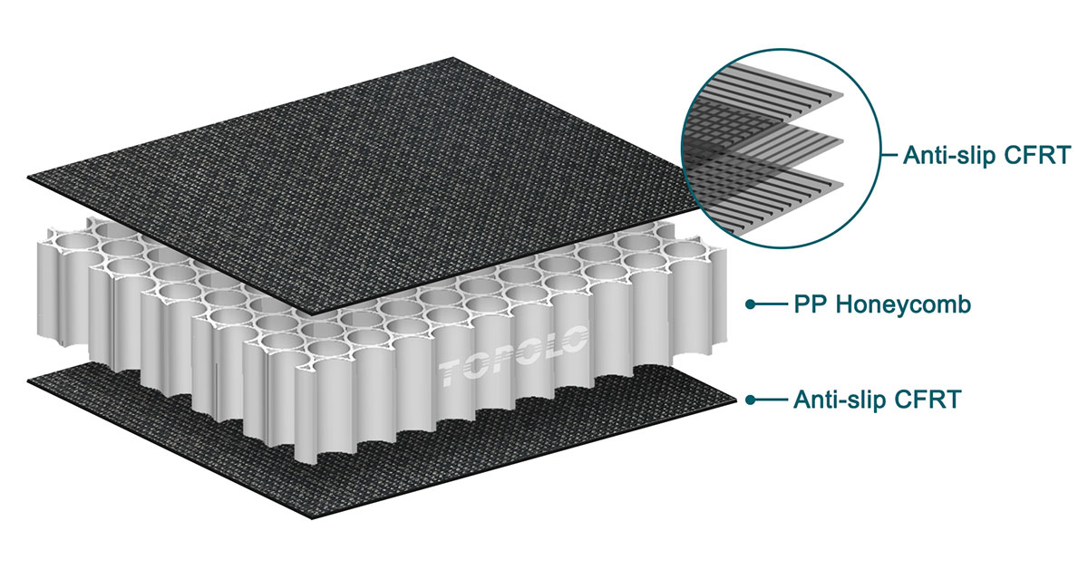 Сотовые панели из термопластичного полипропилена состоят из полипропиленового сотового сердечника и термопластиковых оболочек, армированных непрерывными волокнами (CFRT). После термопластиковой композитизации образуется поверхность с нескользящей текстурой. В отличие от обычных клеевых композитных панелей, при производстве термопластичных композитных панелей не используется клей. Оболочка и материал сердцевины нагреваются в горячем прессе, затем охлаждаются и сплавляются. Свойства термопластов в сочетании с передовыми технологиями термопластичных композитов обеспечивают им множество преимуществ, таких как лёгкость, водонепроницаемость, прочность, износостойкость, нескользкость, пригодность к переработке и простота монтажа.