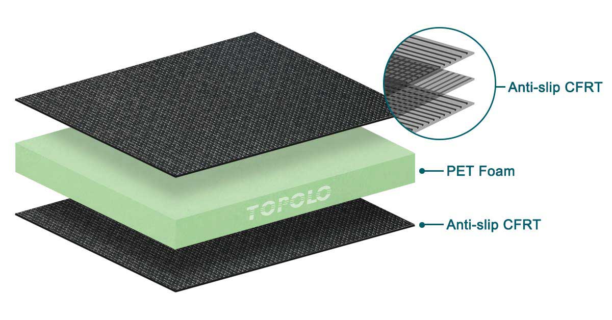 Противоскользящий слой представляет собой композитный материал CFRT (термопластик, армированный непрерывным волокном) с плотной противоскользящей текстурой.