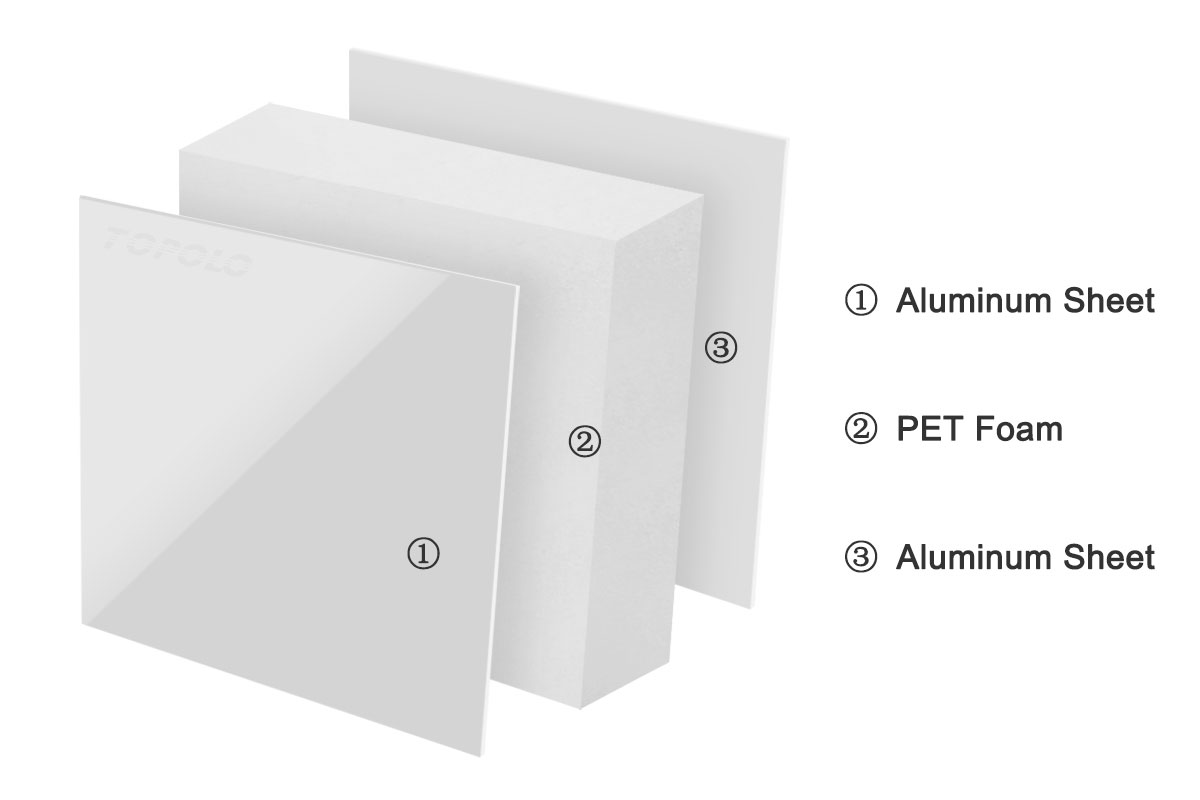 - Высокая прочность: сердечник из пенополистика ПЭТ обеспечивает хорошую прочность на сжатие и сдвиг, а многослойная структура, состоящая из алюминиевой обшивки с обеих сторон и сердцевины из пенопласта ПЭТ посередине, придает панели высокую общую прочность.